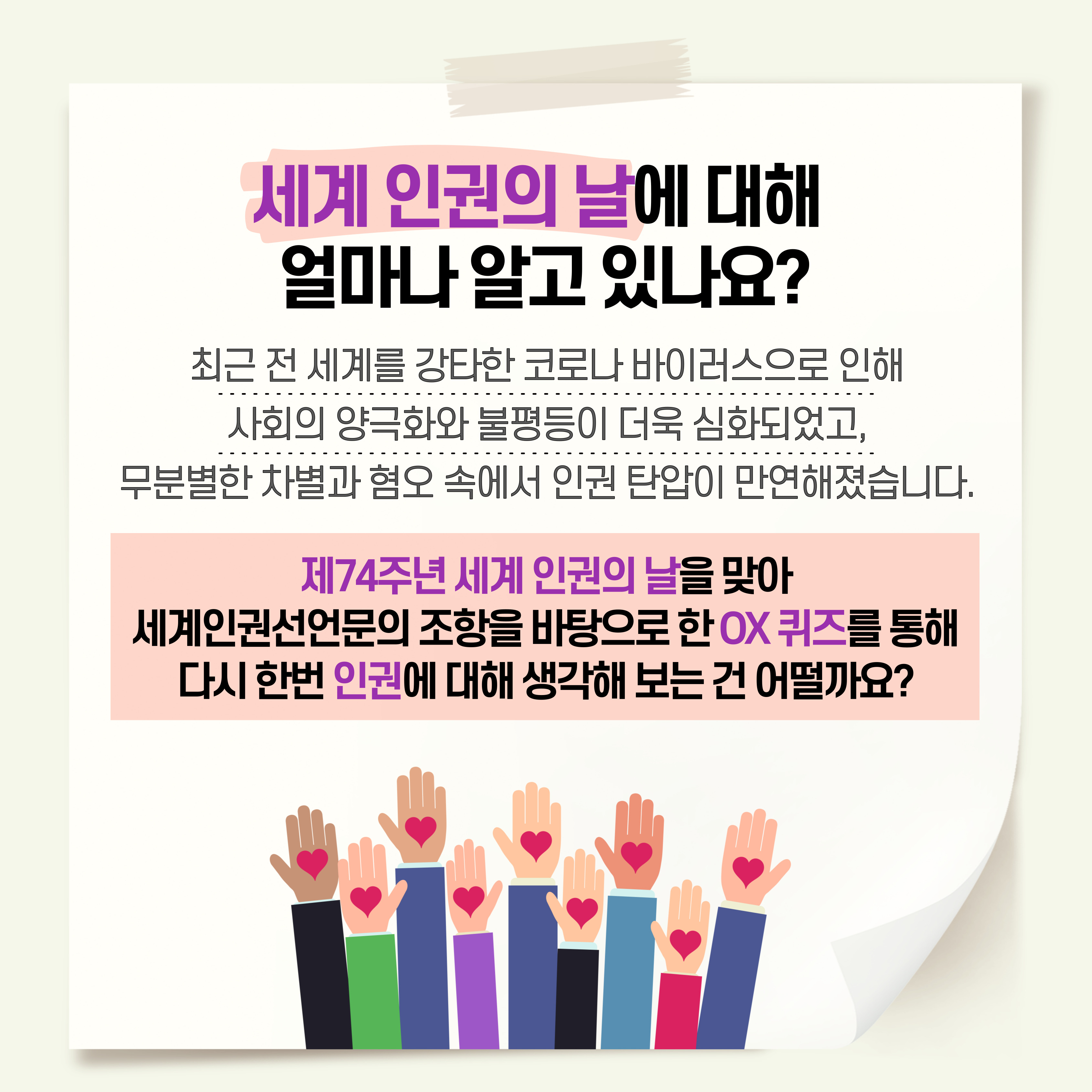 세계인권선언문의 내용을 바탕으로 한 OX퀴즈를 통해, 세계인권에 대해 알아보는건 어떨까요?
