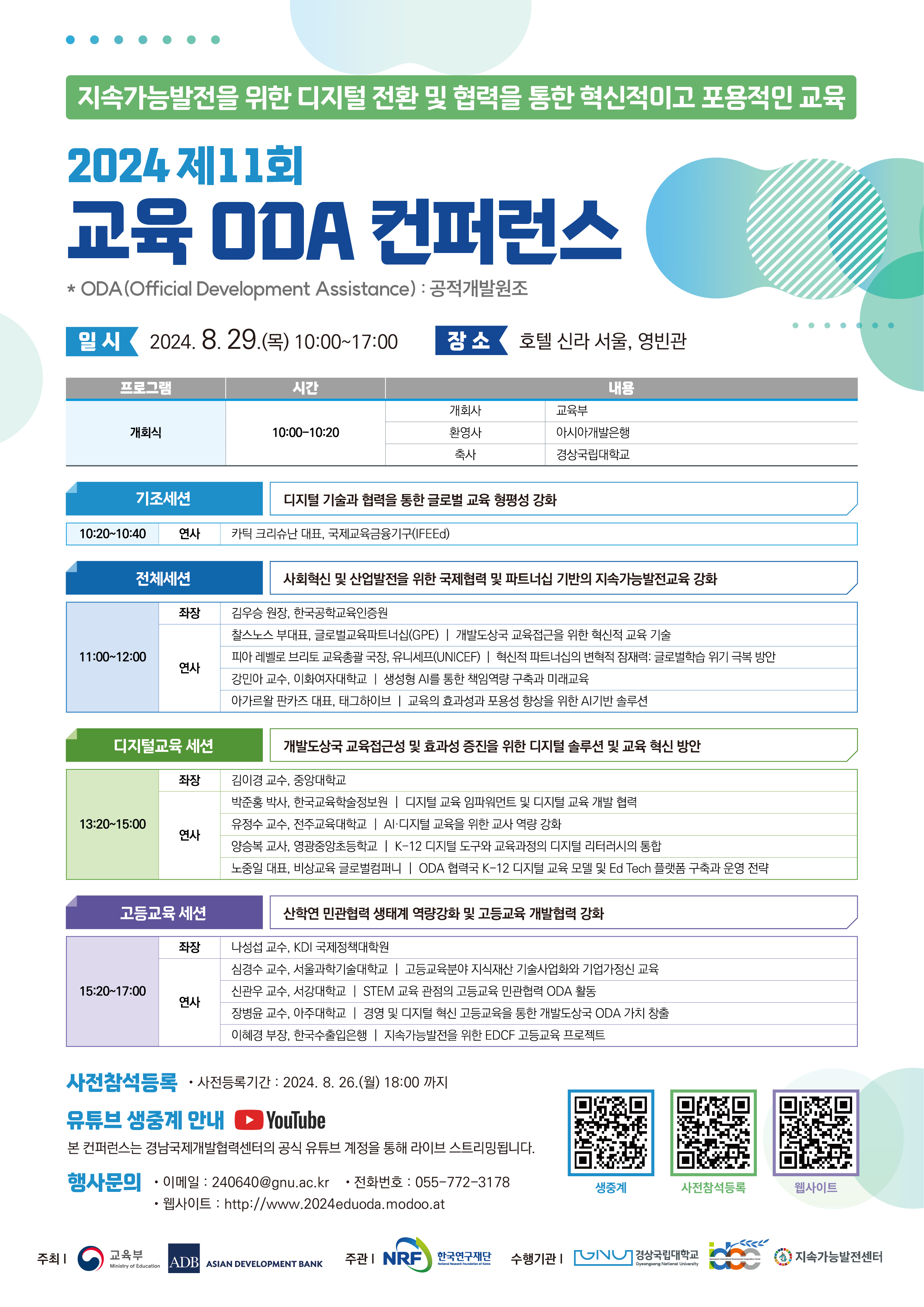 교육부가 주최하고 한국연구재단이 주관, 경상국립대 수행하는 2024년 제11회 교육 ODA 컨퍼런스를 개최합니다.