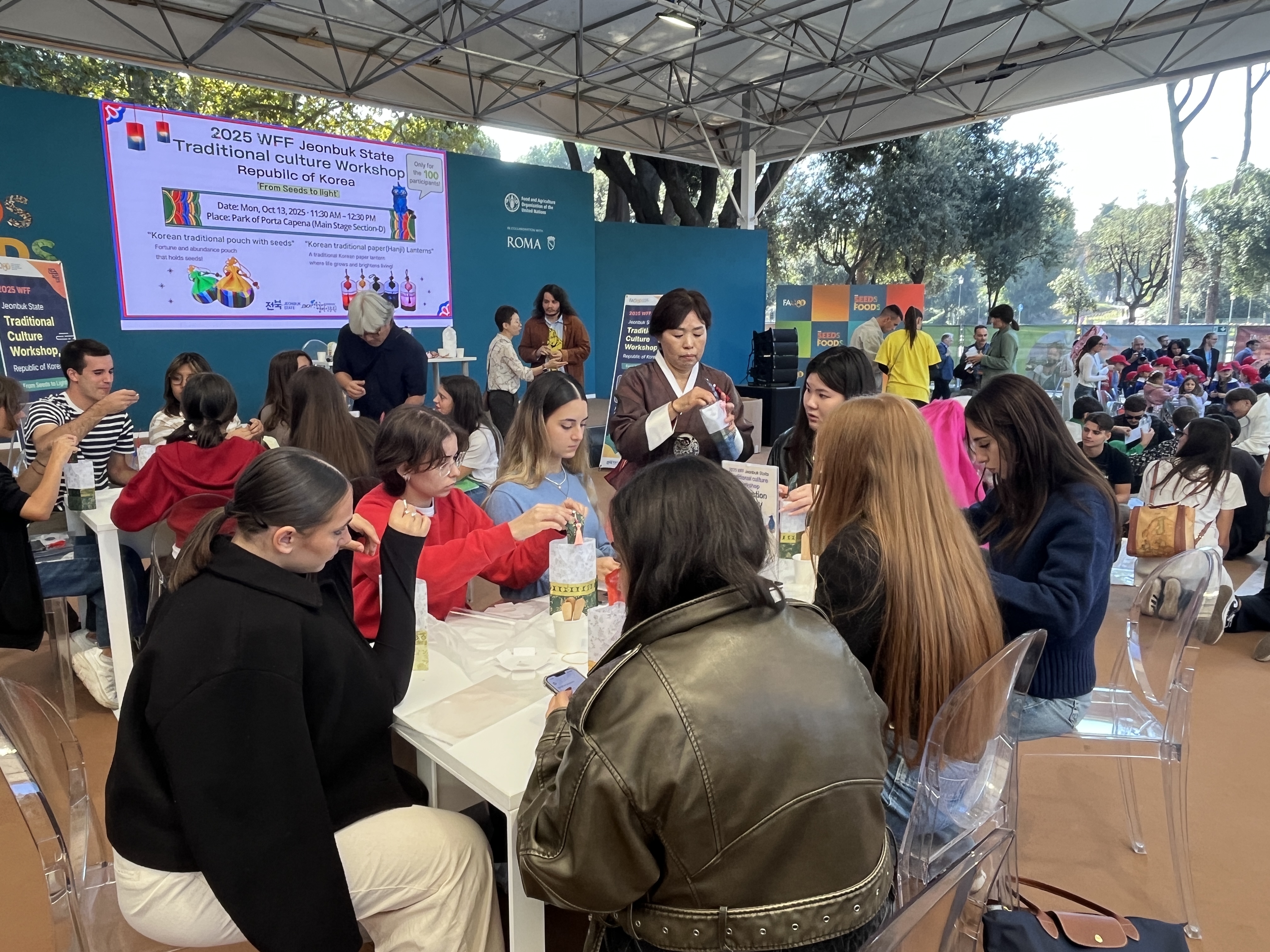 행사 기간 동안 운영된 ‘전북 전통문화 워크숍’에는 약 200여 명이 함께했다. 참가자들은 전북을 대표하는 한지를 활용해 청사초롱을 만들고 씨앗 복주머니 체험에 참여하며, ‘From Seeds to Foods’라는 지속가능성 메시지를 직접 담아냈다.